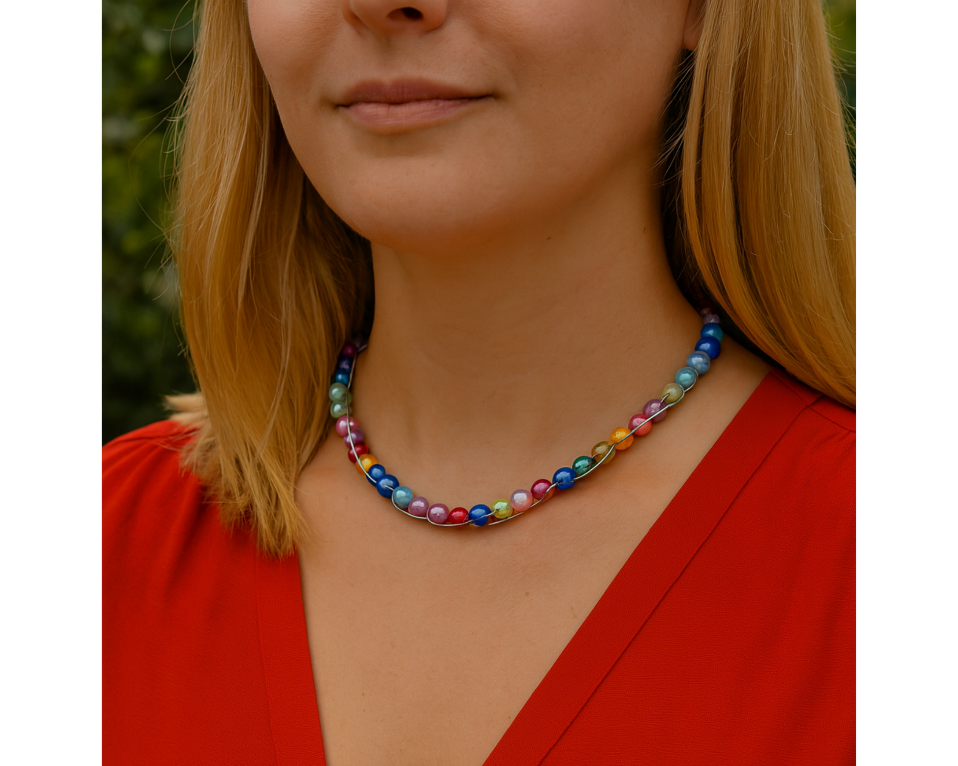 Durch die doppelte Fädelung auf kunststoffummanteltem Edelstahldraht wirkt die Kette voluminöser und bleibt gleichzeitig angenehm leicht und flexibel.