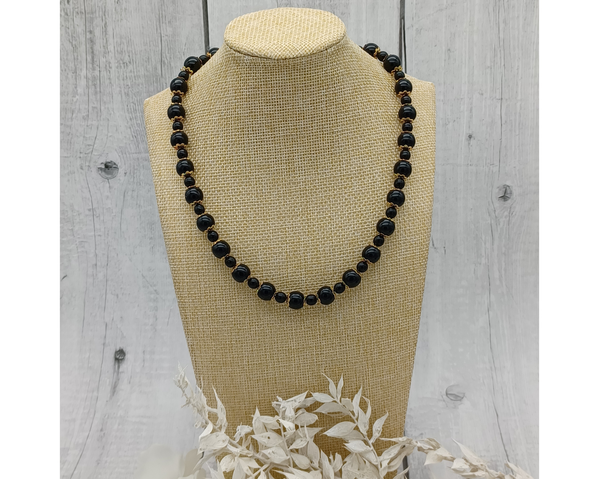 Jede Perle wurde mit Liebe zum Detail ausgewählt und sorgfältig verarbeitet, sodass jedes Schmuckstück ein echtes Unikat ist. Die Kombination aus tiefem Schwarz und warmem Gold verleiht der Kette einen luxuriösen Charakter, der den Blick magisch anzieht.