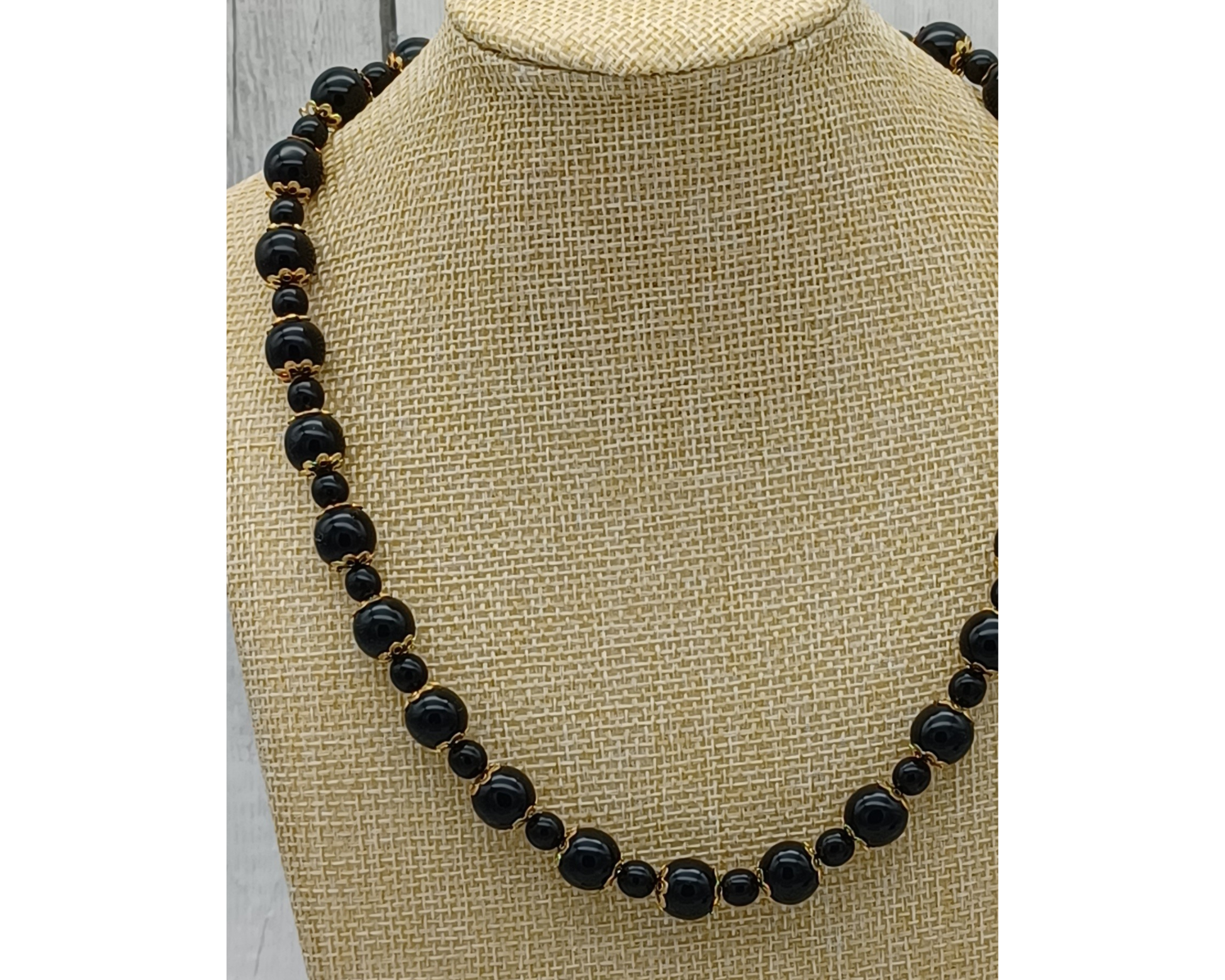 Diese handgefertigte Unikatkette ist mehr als nur Schmuck – sie ist ein Statement aus Stil und Individualität. Auf einem fein gefädelten goldenen Schmuckdraht wechseln sich edle schwarze Perlen in 10 mm und 6 mm Größe mit glänzenden goldenen Kappen ab und schaffen ein harmonisches Spiel aus Kontrast und Eleganz.