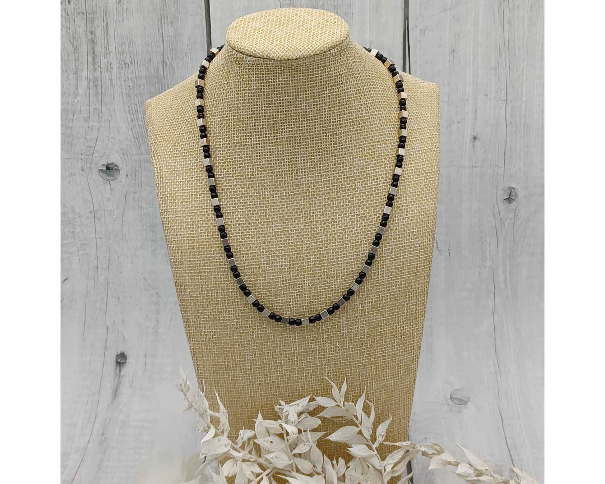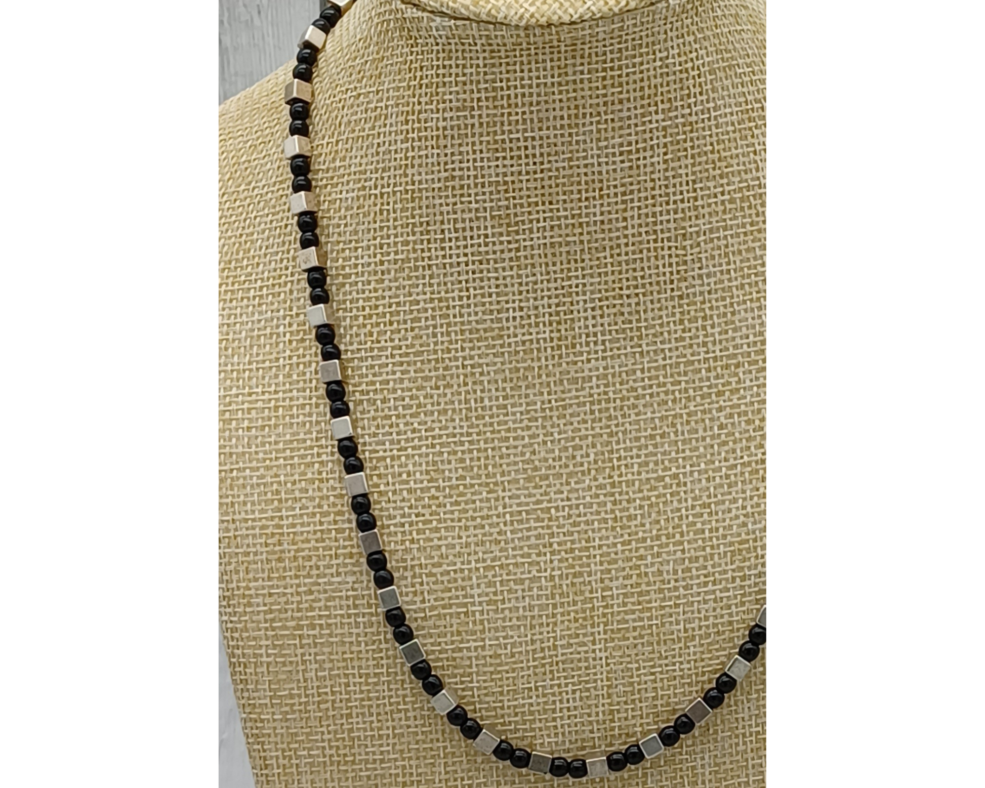 Diese handgefertigte Unikatkette verbindet schlichte Eleganz mit einem Hauch von Extravaganz. Auf einem fein gefädelten Edelstahldraht reihen sich schwarze 4 mm Perlen aneinander, unterbrochen von glänzenden silbernen Würfeln, die dem Design einen modernen und edlen Charakter verleihen.
